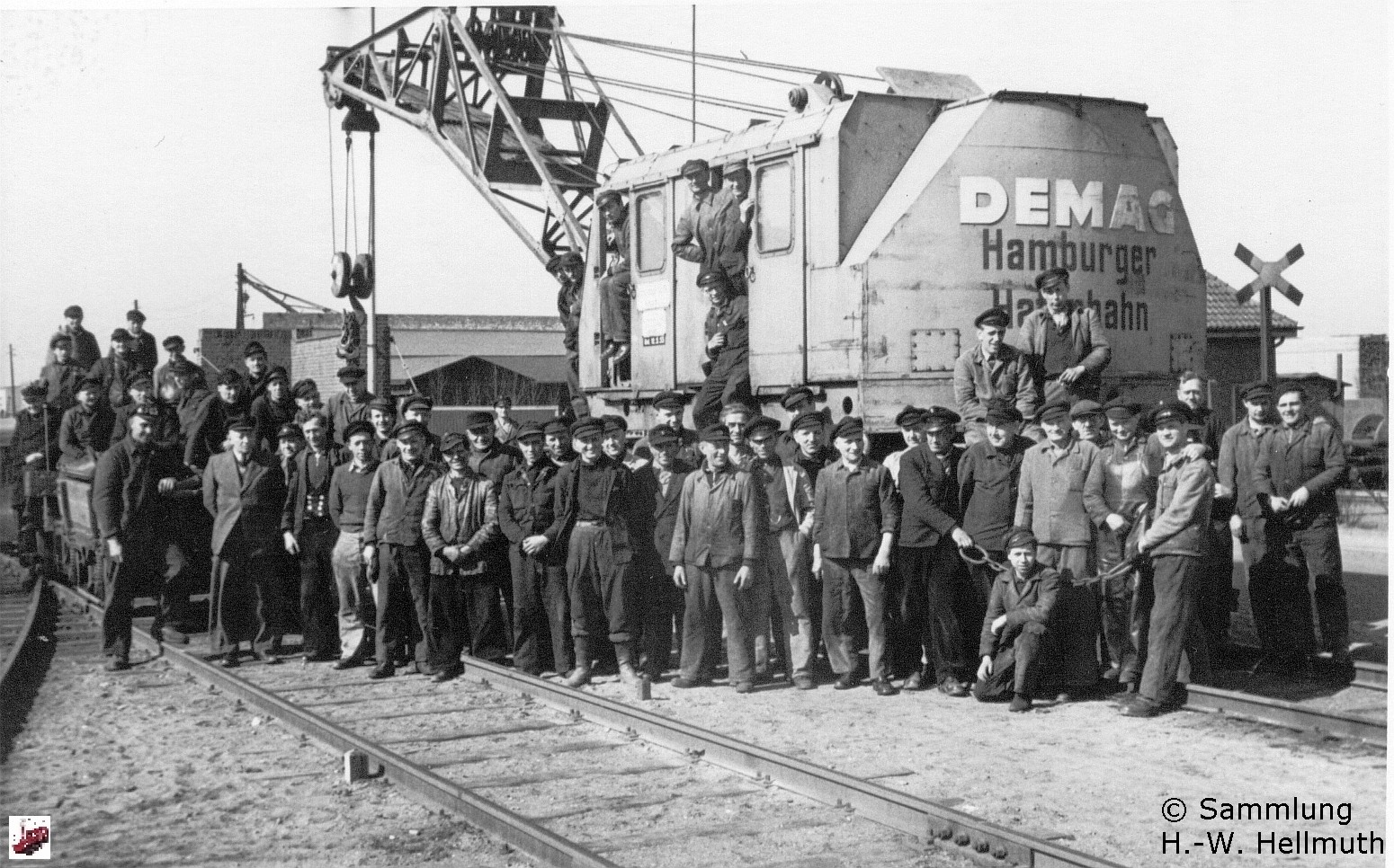 Ein Mitarbeitertreffen vor dem Eisenbahndrehkran 215 auf dem Werkplatz der Hamburger Hafenbahn auf der Spreehafeninsel,
